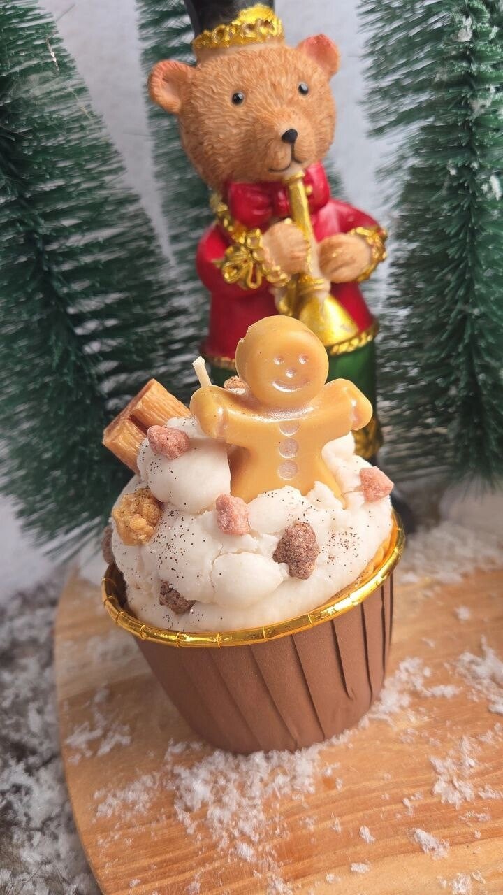 Een schattige, ambachtelijke cupcake kaars met gingerbread man volledig handgemaakt.
